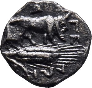 Münze 15 | Flussgott als Vorderteil eines menschengesichtigen Stieres, in Stiela geprägt