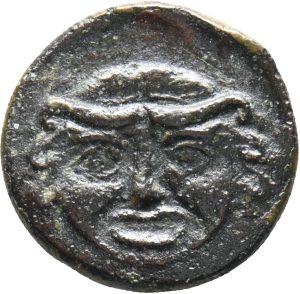 Als Motiv ist das Gorgoneion in der Antike allgegenwärtig wie auf dem Schaleninnenbild (2). Als übelabwehrendes Zeichen ziert es z.B. Stirnziegel von Tondächern (3). Auch auf sizilischen Münzen begegnen sie nicht selten (4-7). Allerdings ist dessen Funktion auf dem Geld bisher nicht befriedigend erläutert.